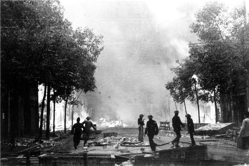 △1940年8月,在日機燃燒彈的轟炸下,陷入火海的重慶街道。
