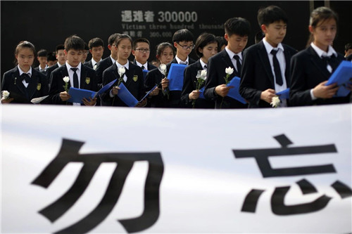 △清明節,中學生在侵華日軍南京大屠殺遇難同胞紀念館內舉行儀式,悼念遇難同胞。