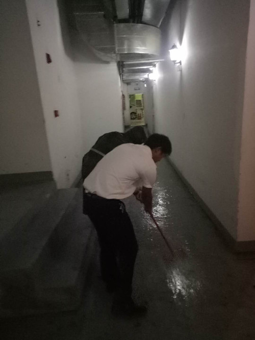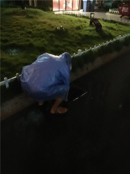 為了不讓雨水倒灌影響業主出行,掃水工作從白日到黑夜,一直在進行著,伸出去,收回來,這個動作不知反復了多少次,只是在拿起水杯時,手臂不受控制的顫抖......