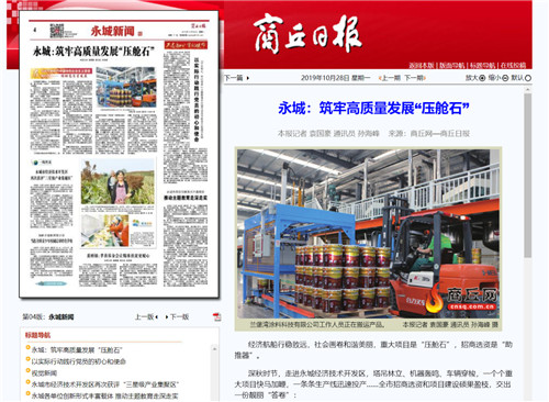蘭堡灣涂料科技有限公司,作為高質(zhì)量發(fā)展優(yōu)秀企業(yè)代表,榮幸接受中共商丘市委機關報《商丘日報》采訪,并榮登版面頭條!