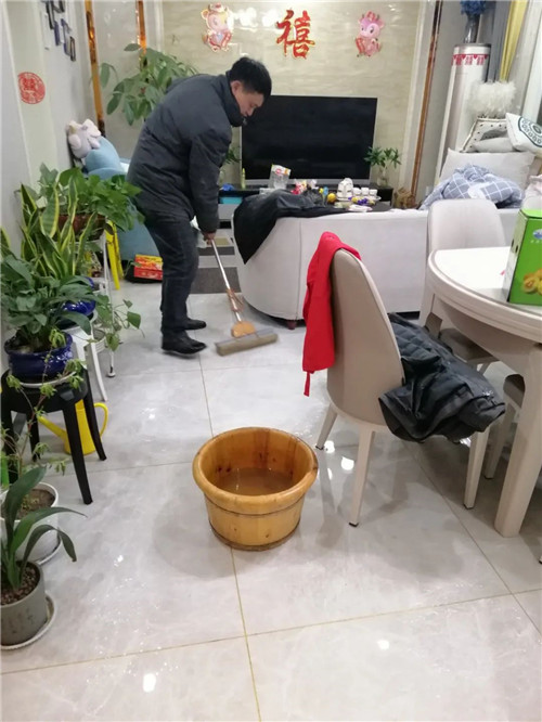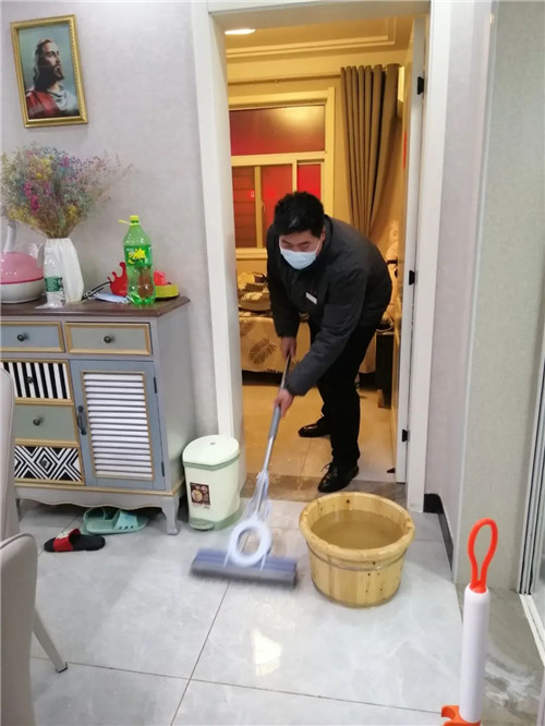 不多時,盛世名門物業工程部人員就上門迅速完成了維修工作。水止住了,但業主的家里也在強力水壓的沖擊下變得水淋淋的。工程部人員完成維修后并沒有轉身離開,而是選擇留下來,一起幫助業主清理家中積水。