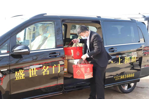 24日,物業服務人員去盛世名門一至四期業主家慰問,送去春聯和新年大禮包。