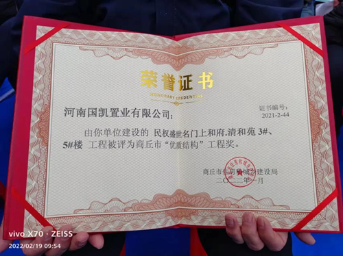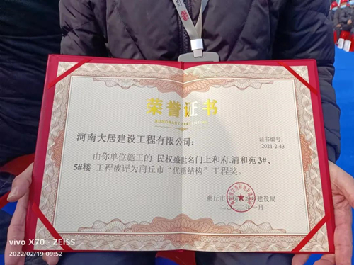 2月19日,在“2022年民權縣建設工程質量、安全、揚塵暨標準化工地現場觀摩會”上,由河南大居建設工程有限公司承建的盛世名門上和府·清和苑3號樓、5號樓項目榮獲商丘市“優質結構”工程獎。名至實歸,可喜可賀!