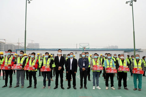 河南國凱置業盛世名門利用留守工人做核酸檢測的機會又將火腿腸、方便面、礦泉水等慰問品送到他們的手中。工人們對物質生活保障自然毫不擔心,更主要的是他們對公司的認同感和精神生活的豐富。
