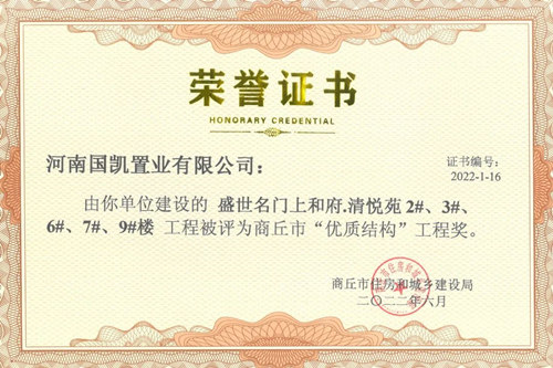 連獲殊榮!盛世名門上和府?清悅苑2號樓、3號樓、6號樓、7號樓、9號樓工程被評為商丘市“優質結構”工程獎!