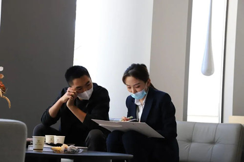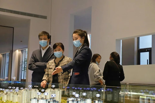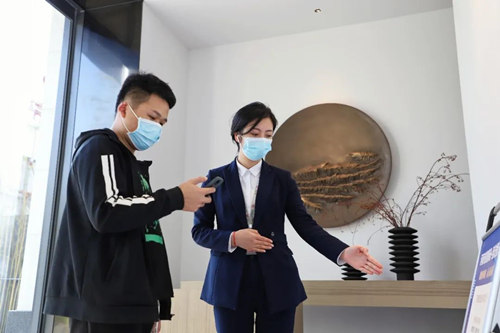 步入美好生活館內(nèi),置業(yè)顧問親切的笑容,30°的躬身禮迎接每位客戶,同時(shí)測量體溫、查驗(yàn)健康碼,使用消毒水消毒,保證場內(nèi)健康、無菌的環(huán)境。