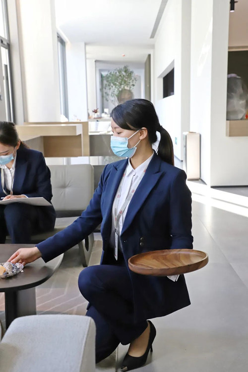 3分鐘內(nèi),服務(wù)人員用優(yōu)雅的體態(tài)送上飲品和小食,腰背挺直、屈膝下蹲、左手執(zhí)托盤,為客人營造全程舒心的服務(wù)體驗(yàn)。