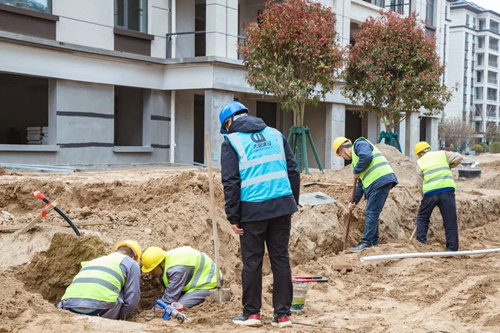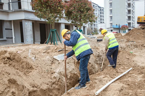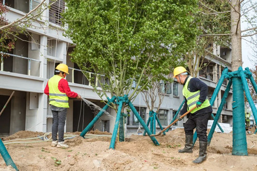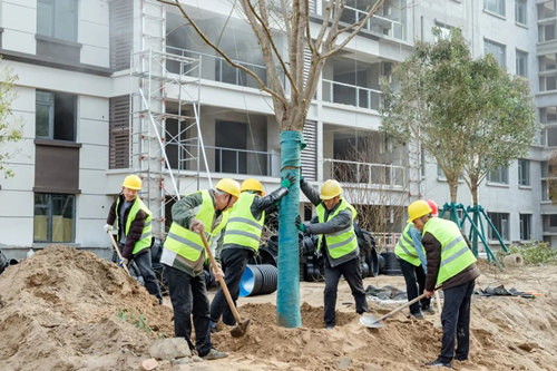 路面一側挖掘機不停地揮動著“機械臂”挖掘、平整土地,為園區(qū)綠化的地形修整塑造,在已經平整并挖好樹穴的土地上,工人們將一棵棵珍貴景觀樹扶正、栽植、培土、壓實、澆水,等到業(yè)主入住后一定是春季有花、夏季有果、秋季有彩、冬季有綠的絕美景象。