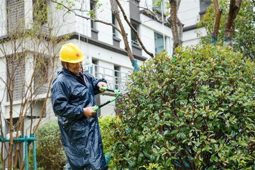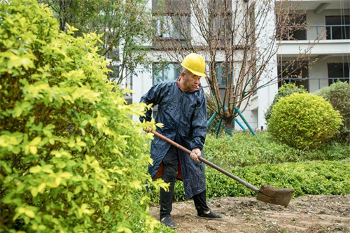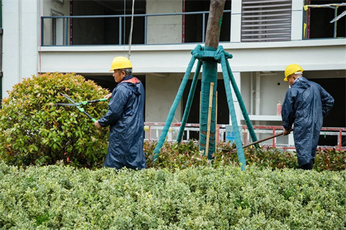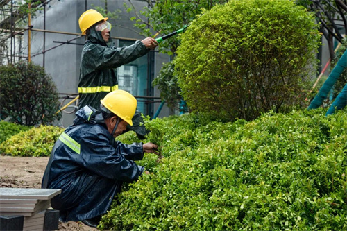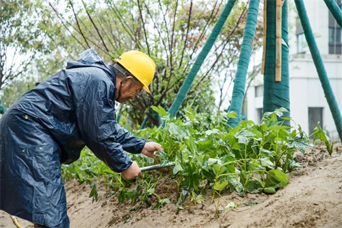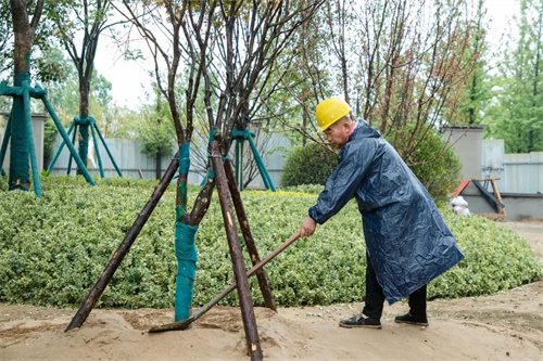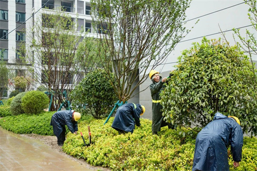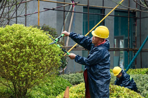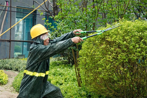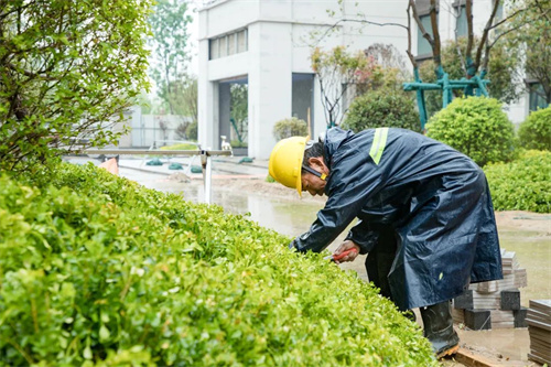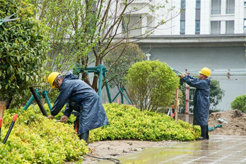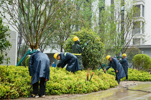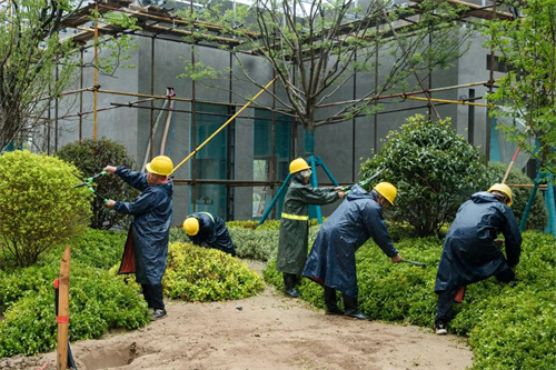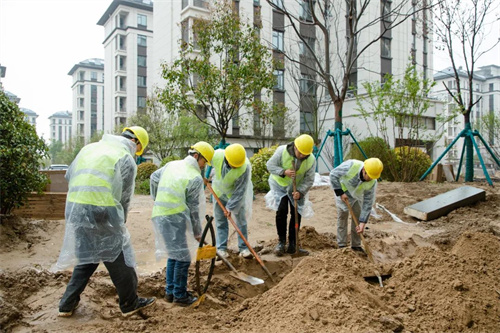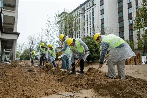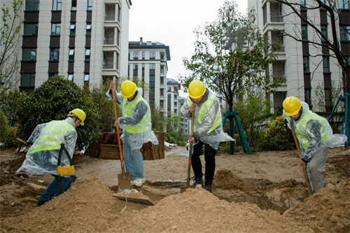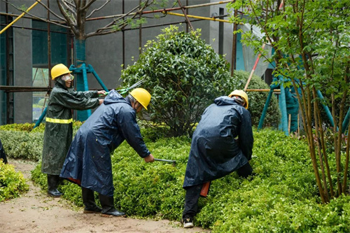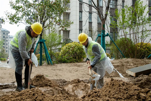 雨水沖刷著工地,卻澆不滅工人的建設熱情。在清和苑景觀綠化施工區域,苗木工人們戴著安全帽,披著雨衣,冒著大雨,有條不紊的進行施工建設,雨水拍打著他們的臉龐,熱情卻依舊高漲,干勁十足。