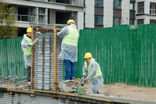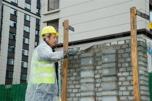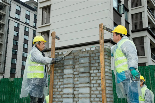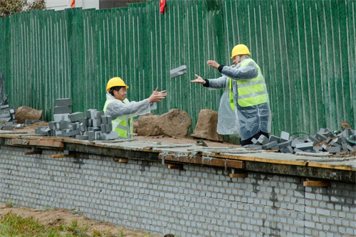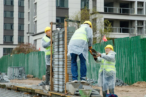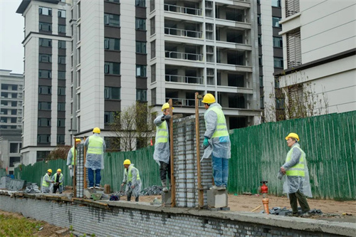 除了苗木栽種,清楓苑地塊社區圍墻砌筑也在加緊施工,工人們分工合作、配合默契,家的輪廓也一點點完善成型。