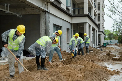 泥濘不堪的施工現場呈現出一片繁忙景象,遠遠望去,每個人仿佛像是在雨中開出絢麗的花朵。