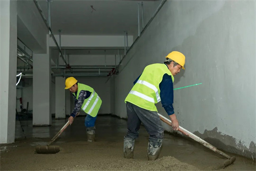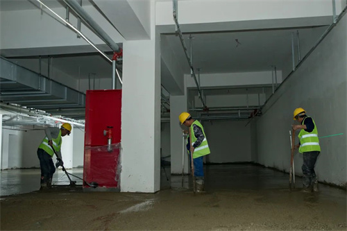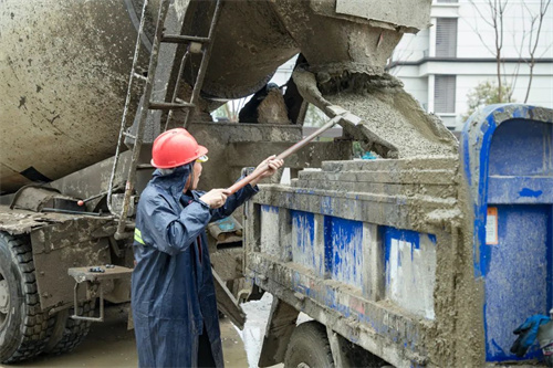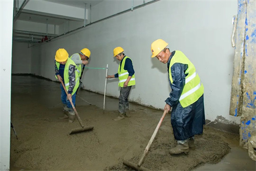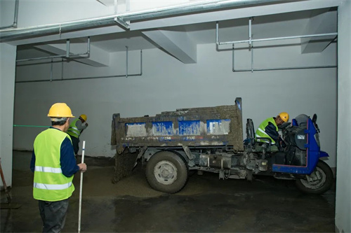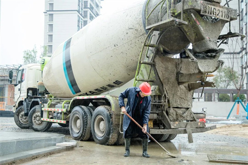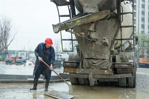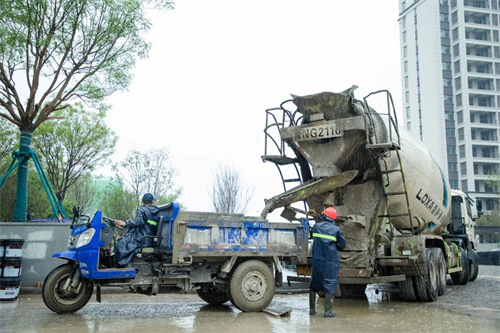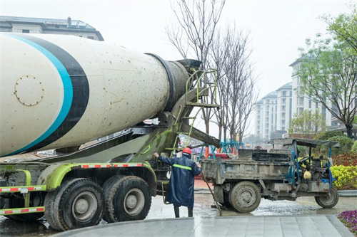 下雨天,路面工種不停,室內工種更是繁忙,在清悅苑地塊,裝載水泥的大罐車來來回回忙碌穿梭,為地下室鋪設地坪作業提供原料。