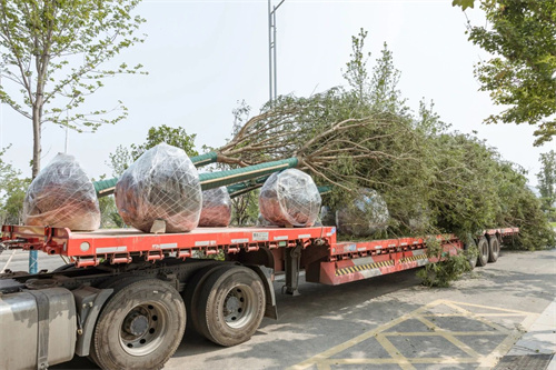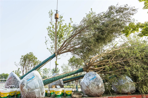 前幾天,具有“家有國槐,升官發財”美好寓意的國槐樹,乘坐著“專車”從全國最大的國槐種植基地河北滄州遠道而來,為了保證國槐樹安然地入住新家,盛世名門的景觀師和工人師傅起了個大早,啟用了多臺大吊車進行整株移植。