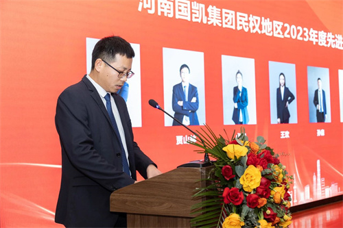 首先,河南國凱集團董事長丁先鋒上臺致辭,針對大環境艱難的2023,民權地區置業、建設、物業各板塊間實現了更緊密的聯合與聯動,取得優異的成績表示祝賀。同時,董事長也對2023年度做出突出貢獻的優秀合作伙伴表示衷心的感謝。