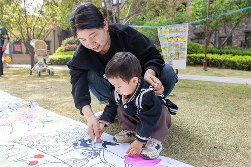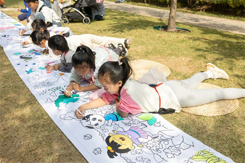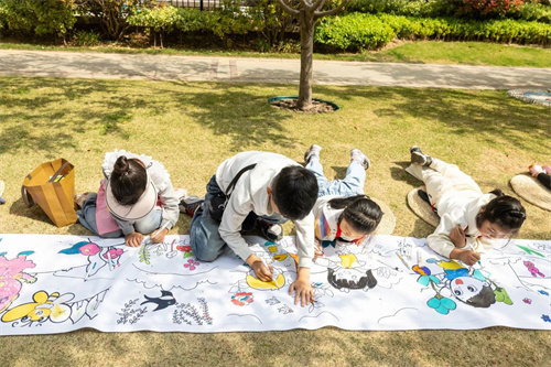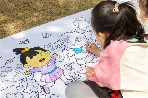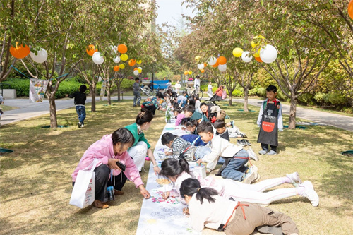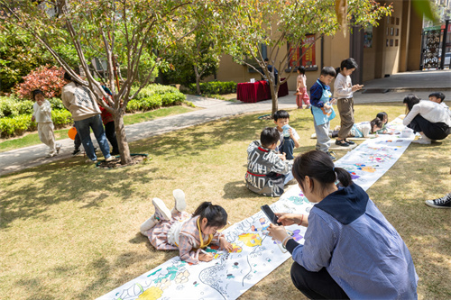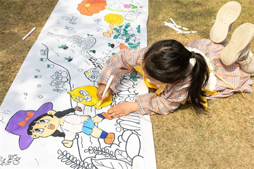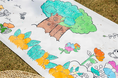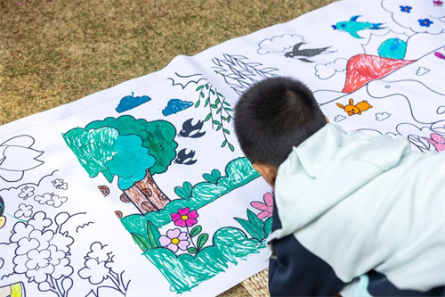 小小的圖案承載著他們豐富的想象,孩子們在創作過程中自主學習、體驗合作繪畫的樂趣。幾個小時過去了,這幅百米大畫作終于出爐!茂密的大樹、牽手玩耍的小朋友、發芽的柳樹......勾勒出一副欣欣向榮、生機勃勃的景象!