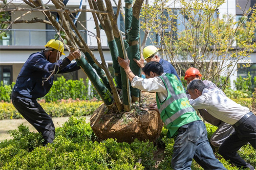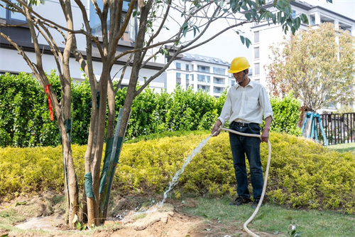 為了保證綠化補栽后的土壤濕度,為苗木創(chuàng)造良好的生長環(huán)境,完成苗木補栽任務(wù)后及時對綠化帶進行澆水、灌溉,同時綠化師傅對新補栽苗木進行了修剪、塑形,提升園區(qū)綠化帶的整體協(xié)調(diào)性和觀賞性。