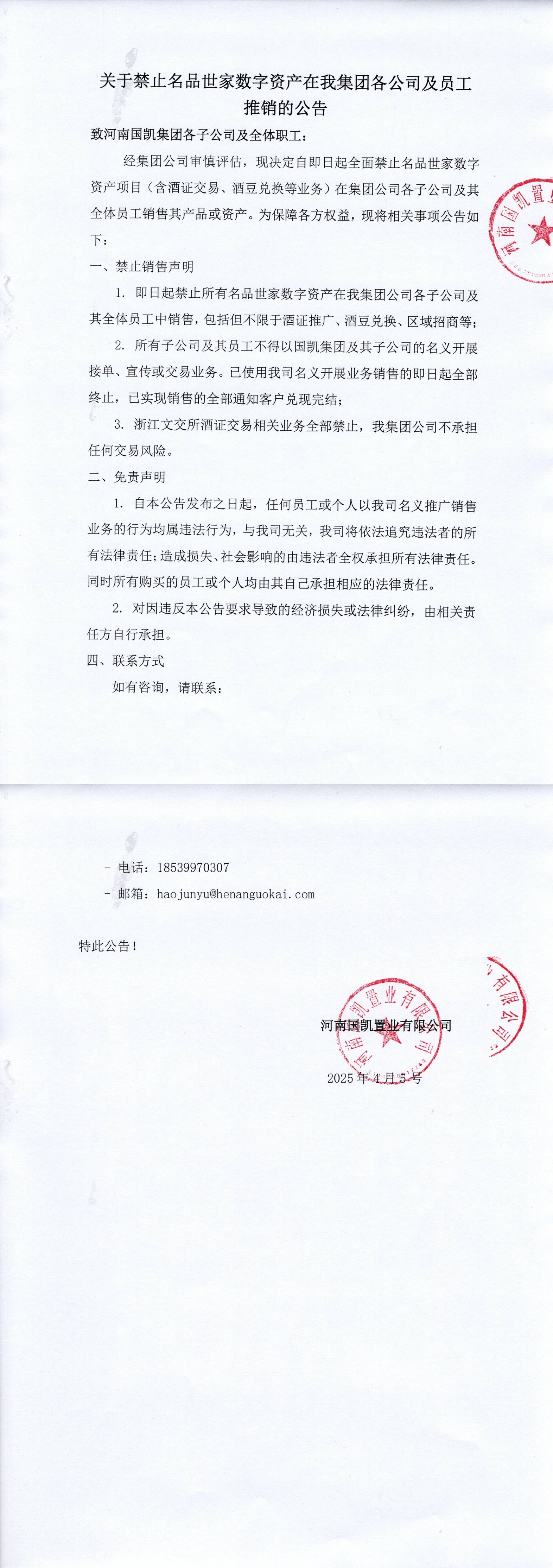 關(guān)于禁止名品世家數(shù)字資產(chǎn)在我集團(tuán)各公司及員工推銷的公告