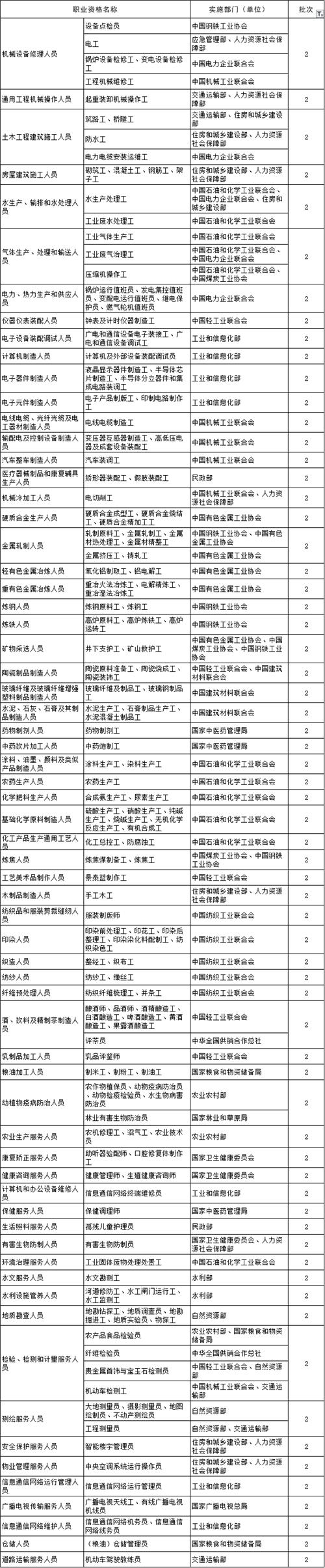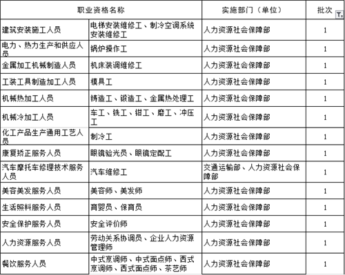 二、今年年底前,擬分批將水平評價類技能人員職業資格退出目錄。人力資源社會保障部門和有關部門組織實施的14項職業資格(涉及29個職業)擬于9月30日前第一批退出。其他部門(單位)組織實施的66項職業資格(涉及156個職業)擬于12月31日前第二批退出。與公共安全、人身健康、生命財產安全等密切相關的職業(工種)擬依法調整為準入類職業資格。上述有關工作請于今年年底前完成(具體安排詳見附件)。