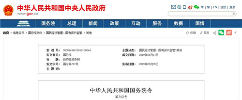 《政府投資條例》已經2018年12月5日國務院第33次常務會議通過,現予公布,自2019年7月1日起施行。