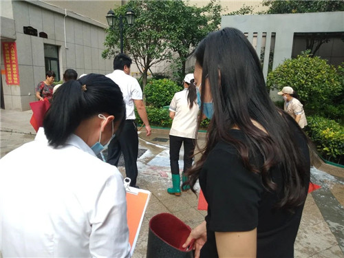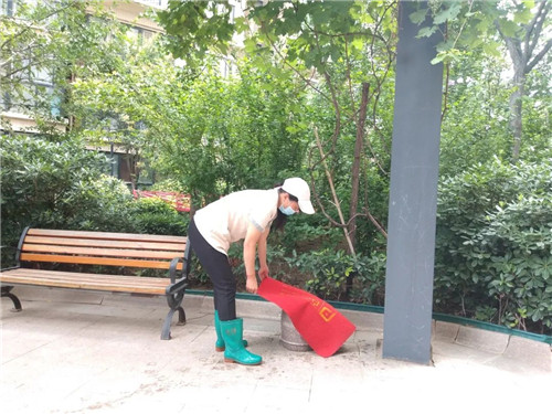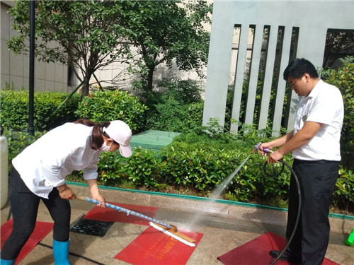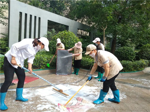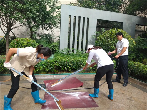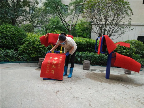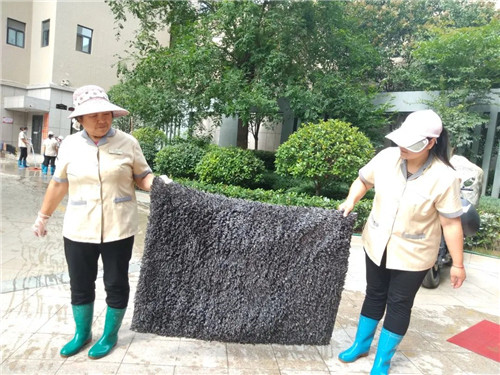 保潔部大姐把洗好的地墊一張一張的晾起來,讓潔凈的地墊享受夏日驕陽的另一番“洗禮”。
