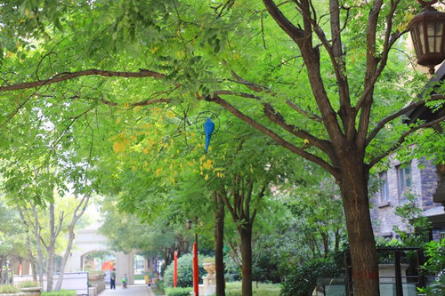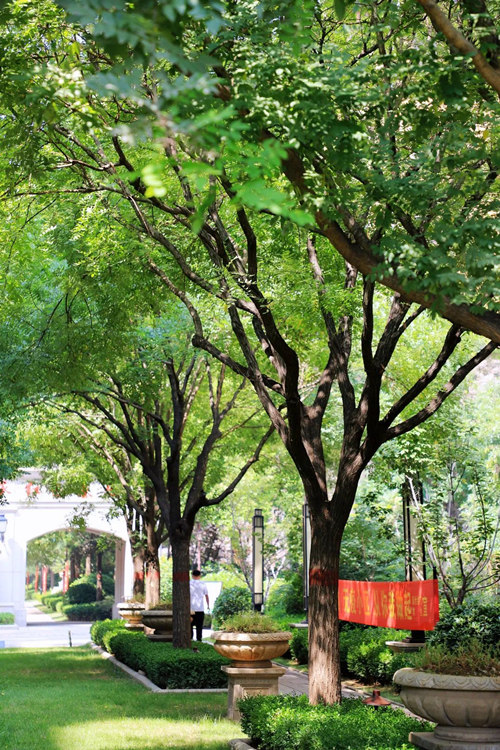 白天您在這散步,您會看到路邊的草坪靜靜的躺在花木樹下,各種高低不同的花草錯(cuò)落有致,最邊側(cè)還有高大的國槐,這些國槐沒有悲歡的姿勢,一半在土里安詳,一半在風(fēng)里飛揚(yáng),一半為我們?yōu)⒙潢帥?,一半自己沐浴陽光,非常沉默,非常驕傲,從不依靠,也不尋找?/p>