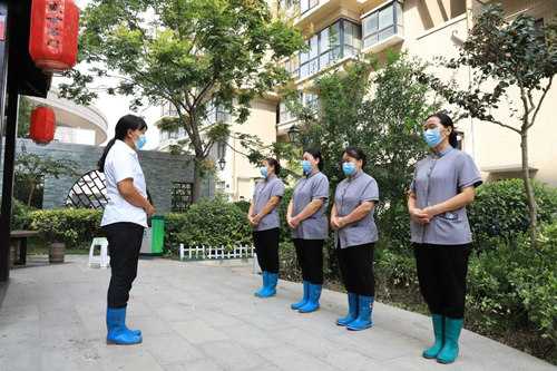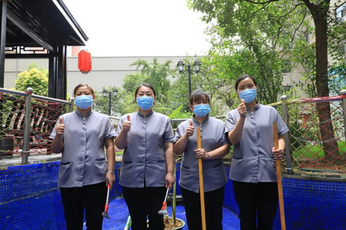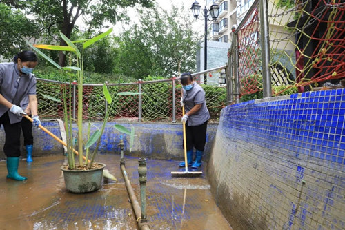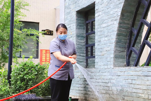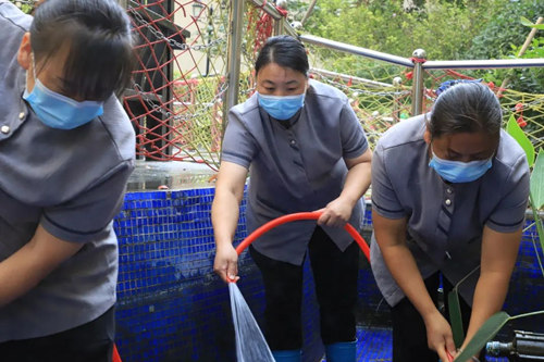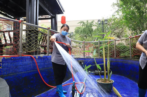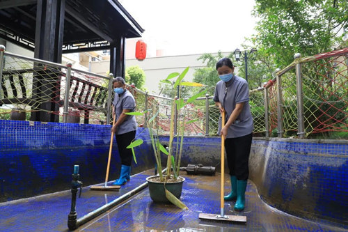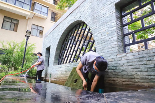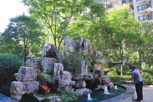盛世名門物業人每周都會抽出3天時間來給小區內的三處水系景觀進行更換水。當天早上,5名保潔人員一起加入到清理水系的隊伍中,大家分工合作,忙而不亂。
