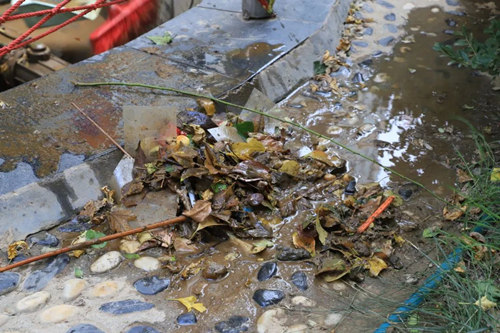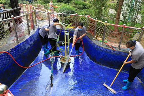 先花費半個多小時用抽水泵把水池里的水抽干,隨即保潔人員換上膠鞋在水池里開始清洗工作。有的清理水池里的腐爛植物垃圾,有的用小桶舀干抽水機無法抽走的污水,有的用鏟子鏟除池底的淤泥,一個個干得熱火朝天。