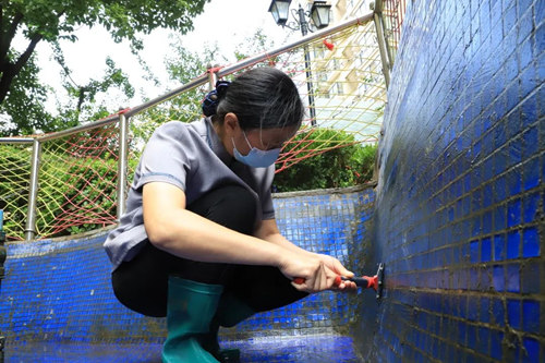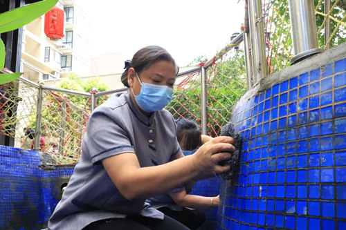雖已入秋,但溫度還比較高,大家忙得汗流浹背,然而看到一處處污漬被刷洗干凈,水池煥然一新,成就感十足,大家的臉上也都露出了舒心的笑容。
