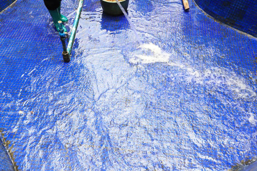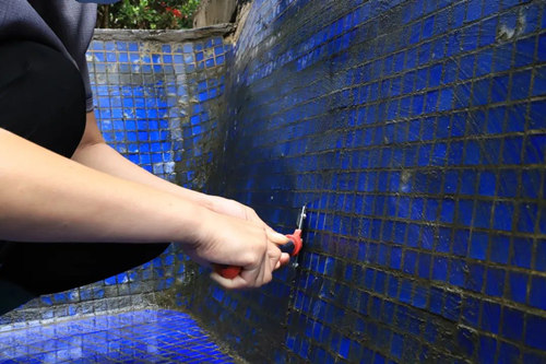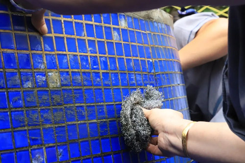 小區中央的水景處,半米高的水池光是抽干臟水就要1個多小時,接著還要再花費將近3個小時進行清理,水池內的瓷磚接縫處是最容易藏污納垢的地方,保潔人員還要用小鏟子或嗆刀等工具,用力清理。