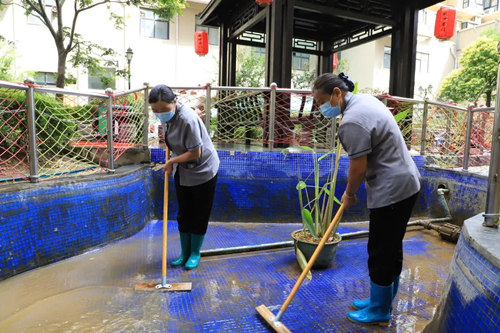 像這樣的水池清洗工作,盛世名門一期物業每周就要進行一次,物業人員嚴格按照水景管理、清洗標準,定期進行水池清理,并對水池內落葉、垃圾等每天定時進行打撈,以保證小區內水系景觀干凈美觀。