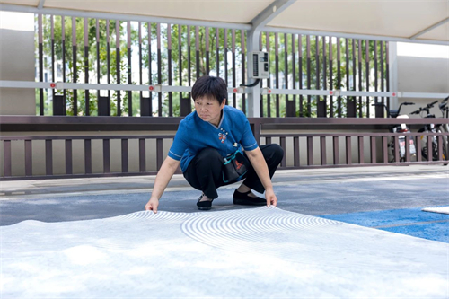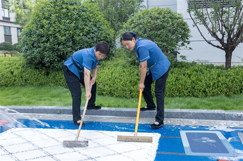 打濕地墊、噴灑專業(yè)清洗劑、排刷去污、水管沖洗、滴水晾干,保潔大姐們分工合作、有條不紊清洗,不放過任何一個污垢。